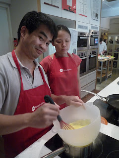 So, lesson 4 was on eggs. And more eggs. It was the most eggy day I've ever had. First up! We did poached eggs. The trick to making perfect poached eggs is to grasp the proportion between water and vinegar. Yup! it's VINEGAR. Bring water to boil, add salt and vinegar, then crack an egg into a cup and carefully add it to the water. It's approximately 4tbsp of vinegar to 500ml of water. It's quite amusing to watch as the egg white envelops round the yolk (with a little help from Mr. Spoon) and forms a pretty little treasure bag. If your egg white become scattered when it hits the water, you need more vinegar. But if you add too much of it, your egg will taste sour. So balance is the key...
